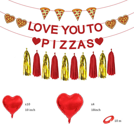 Valentine's Day Party Decoration Set, Heart Balloons, Tassels, Garlands, and Hanging Paper Fans for Anniversaries, Proposals, and Celebrations (Love You to Pizzas)